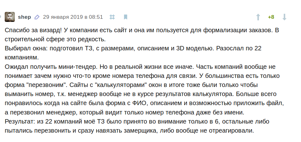Пример. При заказе окон, у клиента есть размеры ему нужно узнать цену сразу или по звонку. Чисто звонок тут работает плохо, не видя стоимости (хотябы примерной - от) клиент просто уходит. Он не хочет тратить своё время на звонок не поняв устраивает ли его стоимость. Если же он увидел и/или рассчитал стоимость сам (калькулятор) или приложил файл и уже получает звонок с предварительно рассчитанной стоимостью нескольких вариантов (можно сказать персональным предложением, т.к. нам понятен объём и.т.д.) - это хорошо мы сэкономили его время. Маркетинговые вещи из разряда сказали 5 тыр, а в реальности 15 или "тупо позвоните" работают сугубо отрицательно на репутацию); -