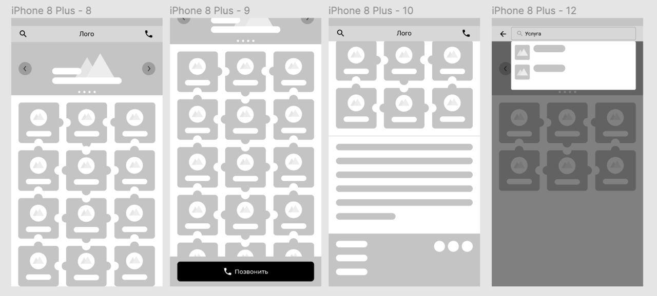 Mobile first + SPA - пользователь должен думать, что это приложение, а не сайт. Не делать слишком длинную ленту из главной (самих услуг/работ ~ 20 - 30). Продумать "unhappy path", когда что-то пошло не так=Модалки обработки ошибок (Пример сервер не вернул список услуг/работ, не удалось создать заказ). Эти варианты нужно отобразить в дизайне (желательно продумать единый happy path для unhappy path ситуаций);
